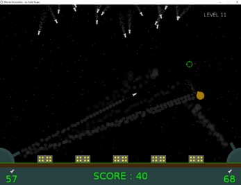 Votre objectif est de protéger les 5 villes à l'aide de vos deux batteries anti-missiles. Si vous perdez les 5 villes, la partie est terminée. Les ennemis arrivent par vagues successives, de plus en plus rapides, et de plus en plus nombreux.
